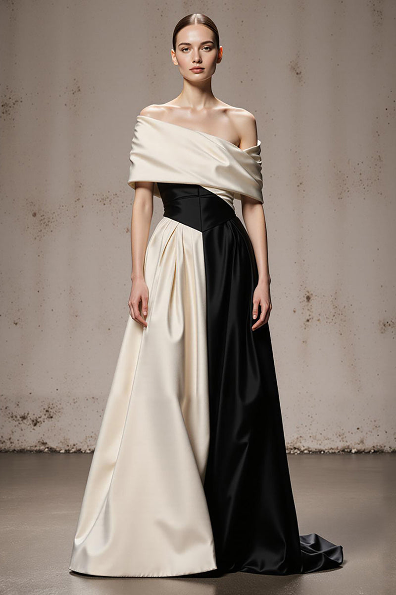 Black and White A Line Satin Patchwork Off the Shoulder Long Formal Dress