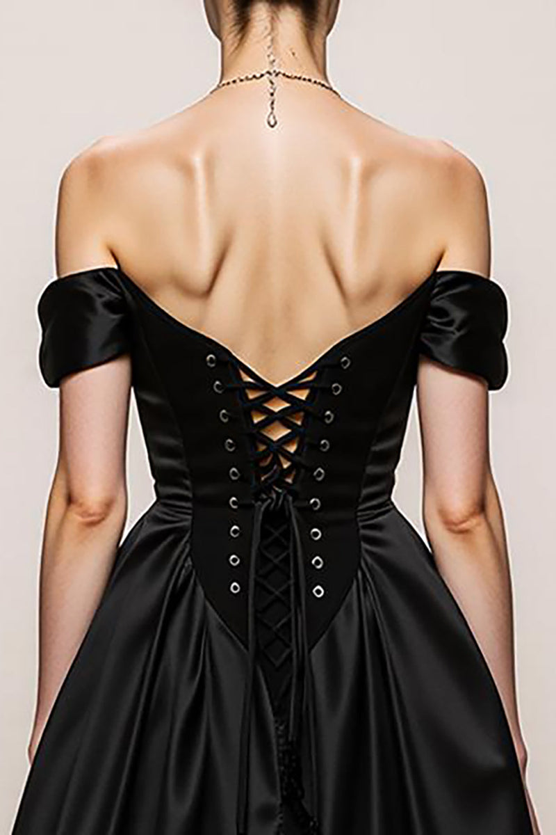 Black and White Satin A Line Sweetheart Off the Shoulder Long Formal Dress