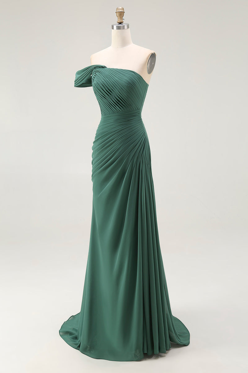 Dark Green One Shoulder Ruched Chiffon Pleated Long Formal Dress