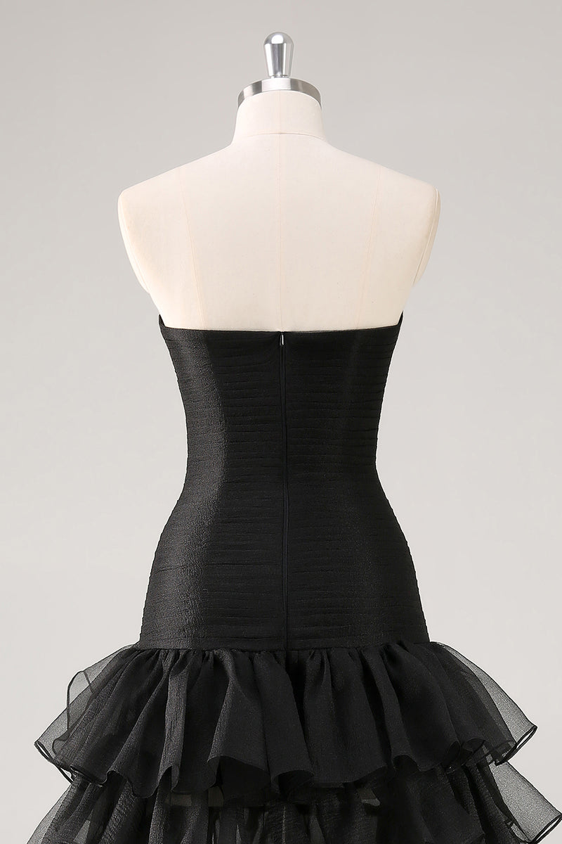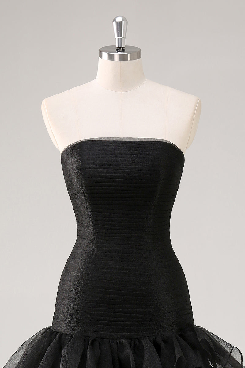 Fashion Design: This elegant black strapless A-line dress, crafted from airy organza, features tiered ruffles and gentle ruching that create a soft, graceful silhouette. The high slit adds subtle allure, while the high-low hem keeps the look refined and timeless. Perfect for those seeking a sophisticated black cocktail dress or a graceful option among black tie dresses, this design effortlessly balances charm and elegance.