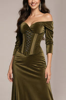 Green Velvet Off the Shoulder Ruched Long Corset Formal Dress with Sleeves