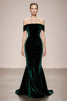 Simple Dark Green Mermaid Velvet Off the Shoulder Long Formal Dress