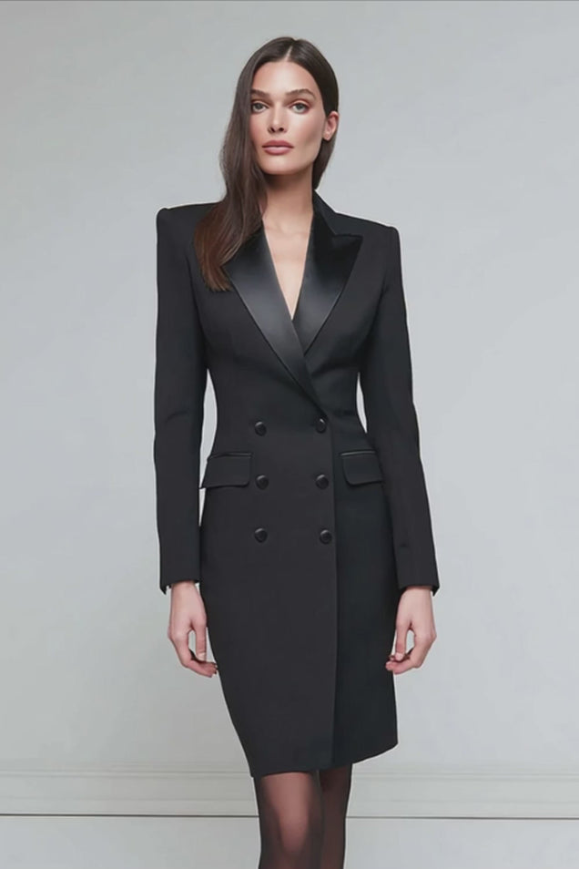 Featured: This black pencil midi blazer dress combines sharp tailoring with sleek elegance. Designed with a peak lapel, long sleeves, and a double-breasted front, it creates a structured silhouette that exudes confidence. The smooth satin finish adds a touch of luxury, making it a refined choice for a polished work look.