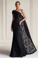 Black One Shoulder Sheath Mother of the Bride Dress with Lace Cape