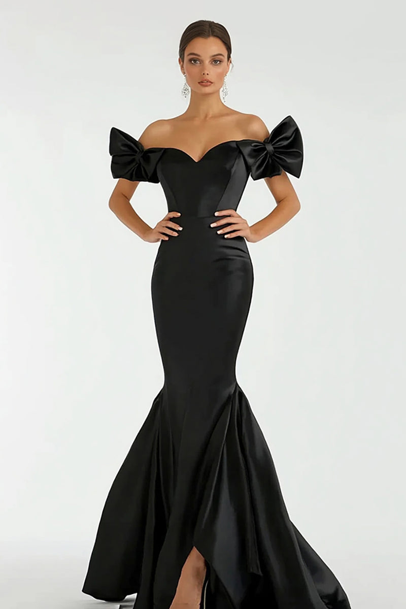 Black Satin Off the Shoulder Mermaid Long Prom Dress with Bows