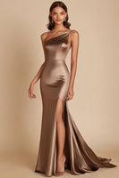 Coffee Satin Mermaid One Shoulder Long Prom Dress with Slit