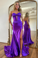 Coral Mermaid Strapless Satin Long Prom Dress with Slit