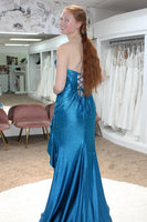 Dark Blue Sparkly Corset Ruffled Mermaid Sweep Train Prom Dress with Slit