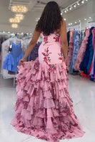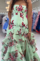 Floral Green Mermaid Tiered Strapless Long Prom Dress with Slit
