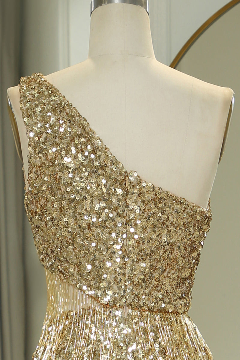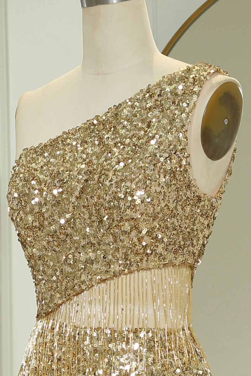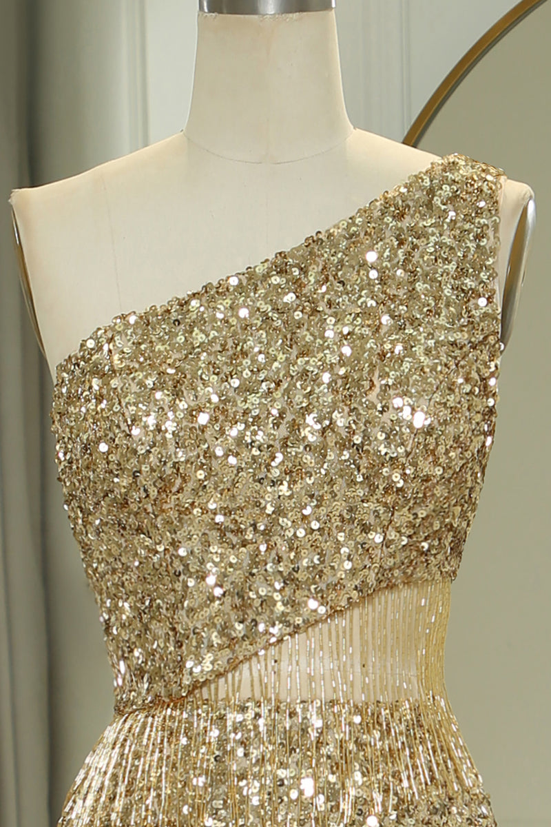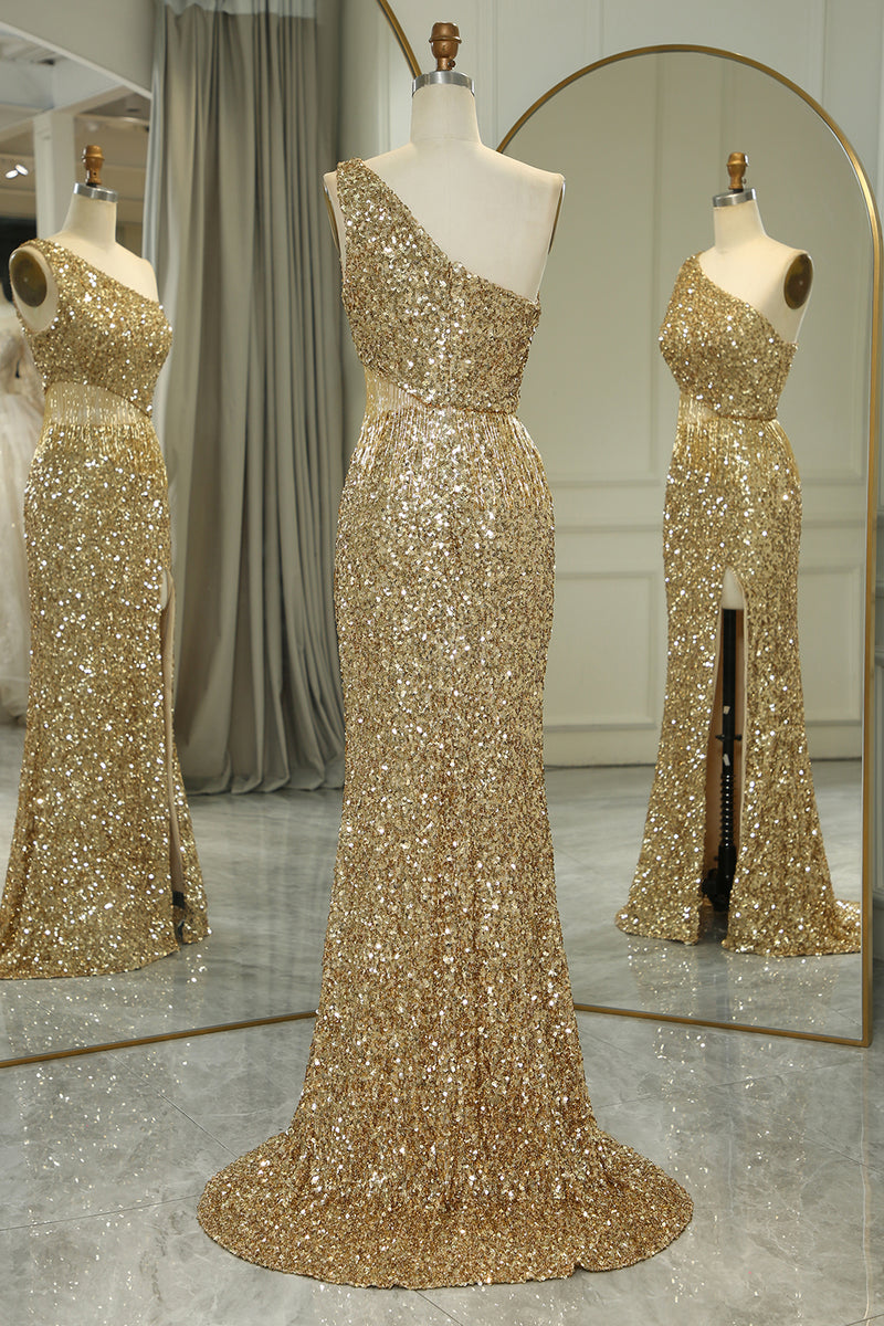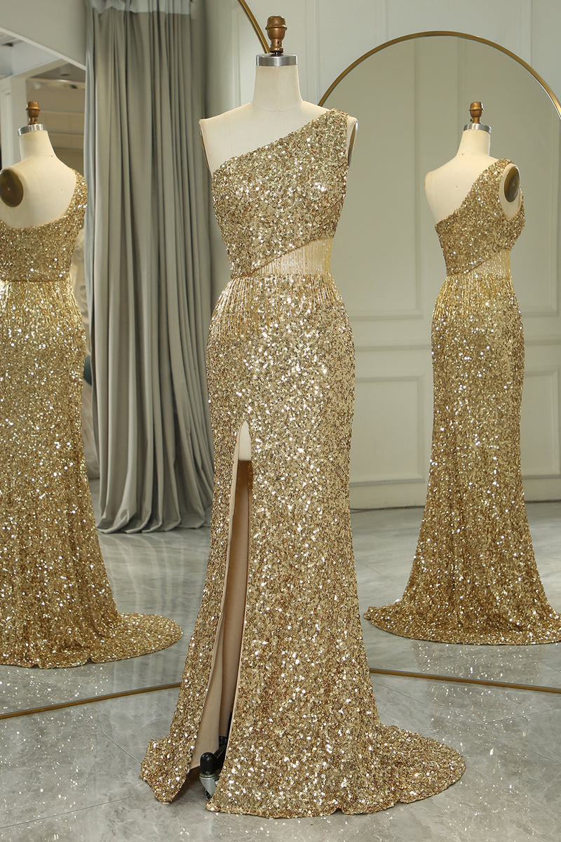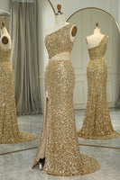 Glitter Golden Cut Out One Shoulder Long Prom Dress With Slit