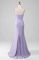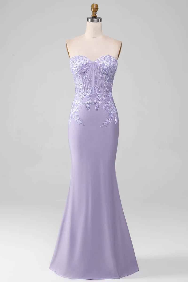 Lilac Mermaid Strapless Long Corset Prom Dress With Appliques
