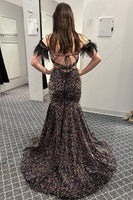Mermaid Off the Shoulder Purple Sequins Cut Out Prom Dress with Feathers