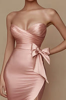 Satin Pink Strapless Ruched Mermaid Long Prom Dress with Slit