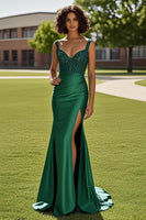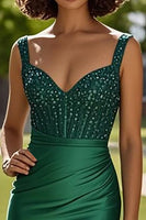 Sparkly Dark Green Corset Beaded Long Prom Dress with Slit