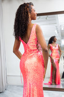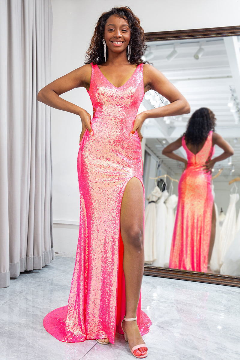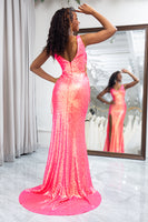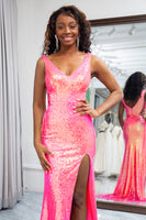Sparkly Hot Pink Mermaid Sequined Long Prom Dress With Slit