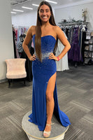 Sparkly Royal Blue Beaded Strapless Long Corset Prom Dress with Slit