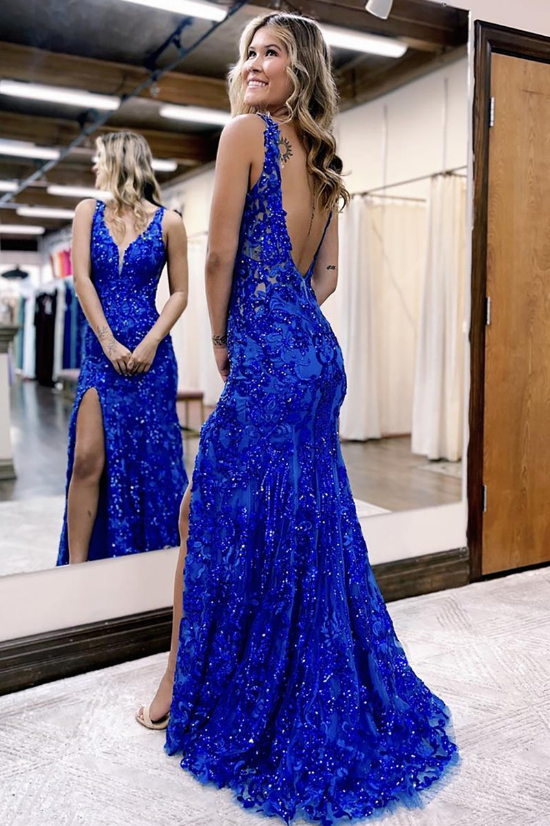 Sparkly Royal Blue Floral Backless Long Corset Prom Dress With Slit