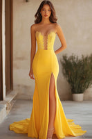 Yellow Chiffon Sweetheart Long Mermaid Prom Dress with Lace