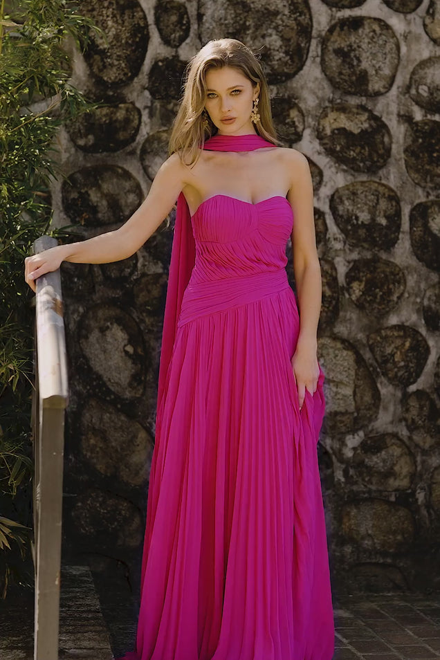 Fuchsia Pleated Strapless A Line Neck Scarf Long Prom Dress