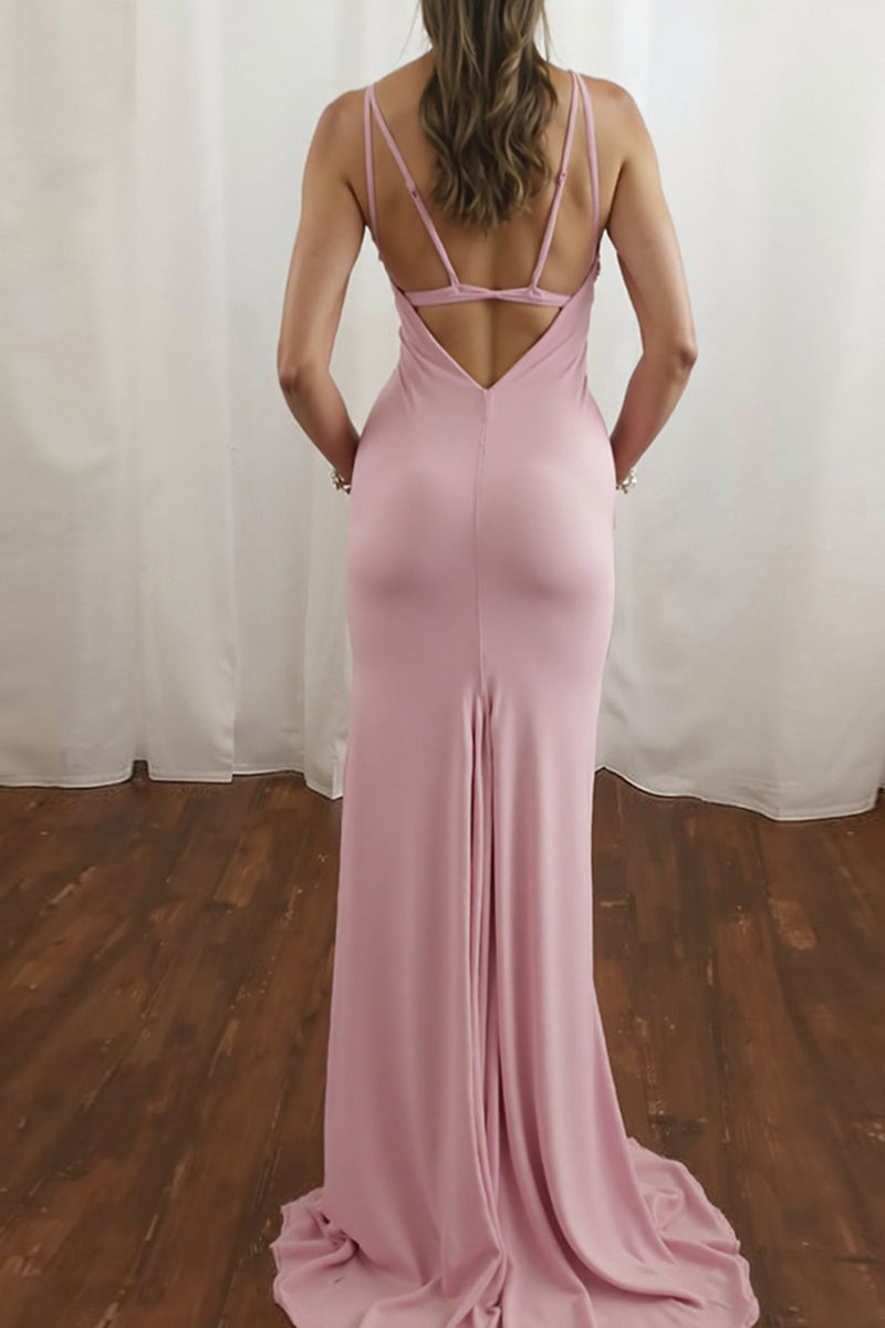 Simple Pink V-Neck Spaghetti Straps Sweep Train Prom Dress