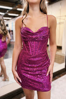 Sparkly Fuchsia Spaghetti Straps Corset Homecoming Dress with Sequins