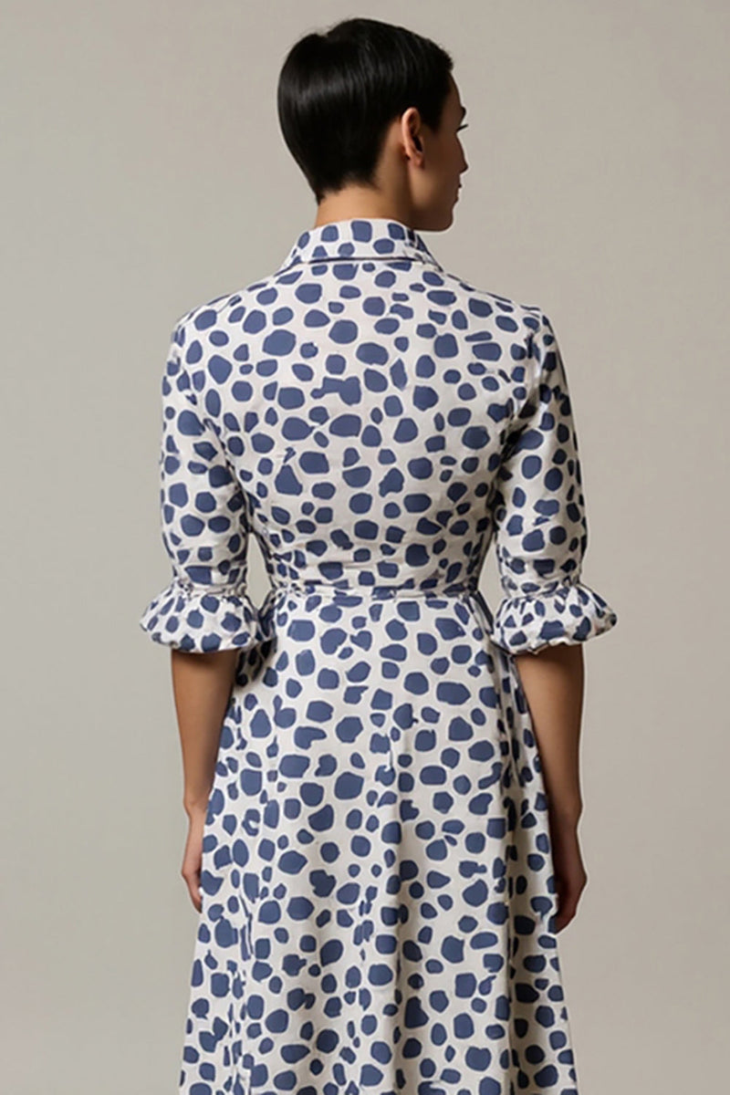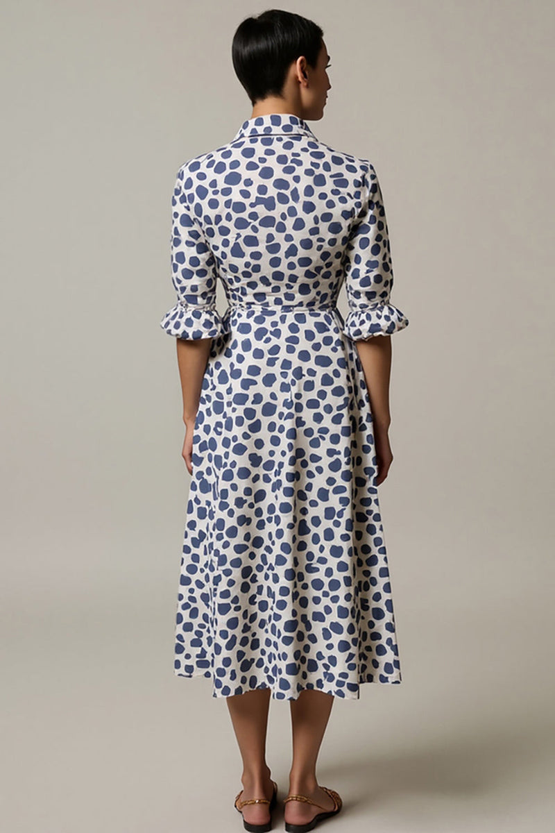 White and Blue Leopard Printed A Line Collar Maxi Work Dress
