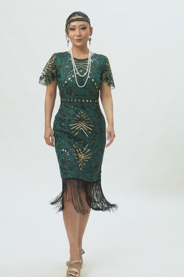 Sparkly Dark Green Sequins Beaded Flapper Dress with Fringes