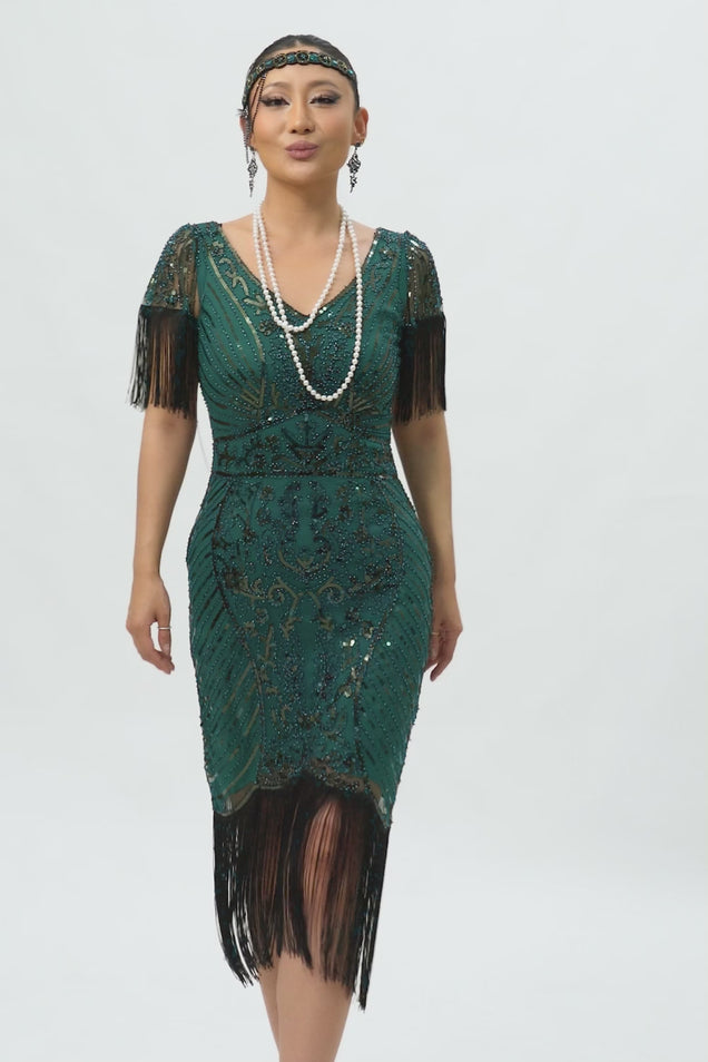 Sparkly Dark Green Sequins V-Neck Flapper Dress with Fringes