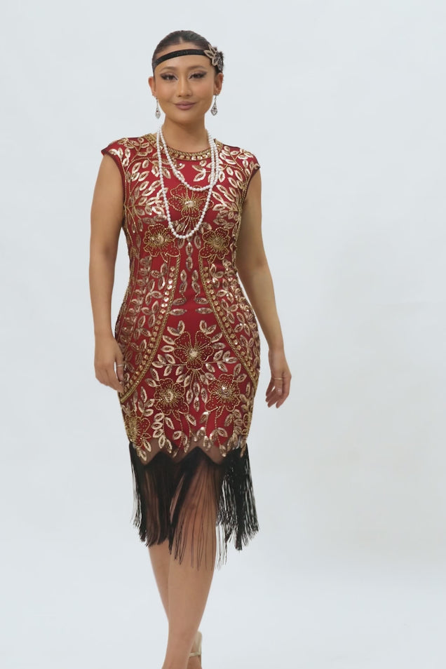 Sparkly Floral Black Bodycon Sequins 1920s Flapper Dress with Fringes